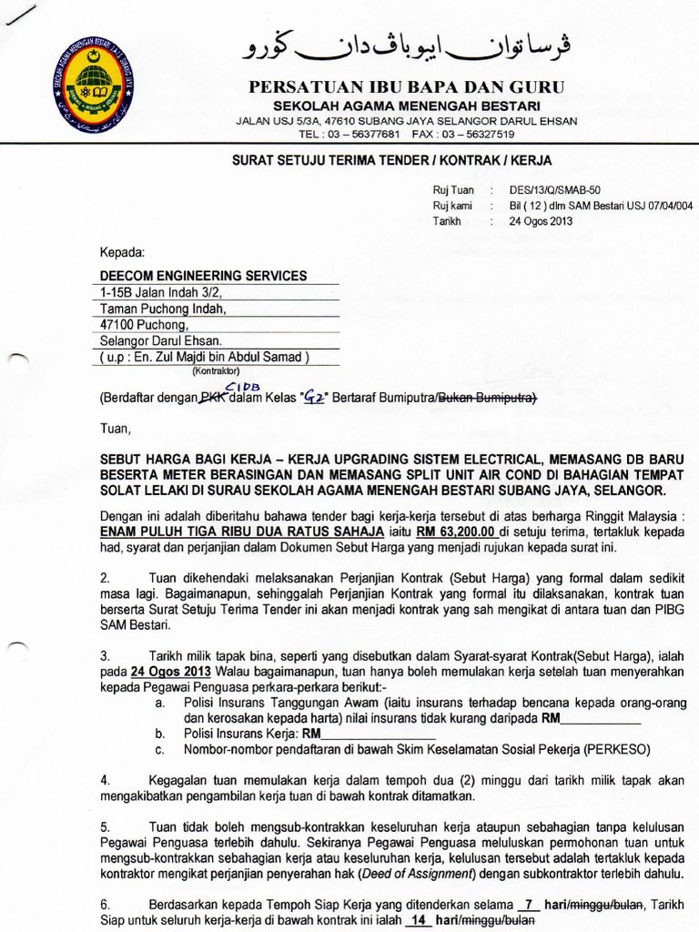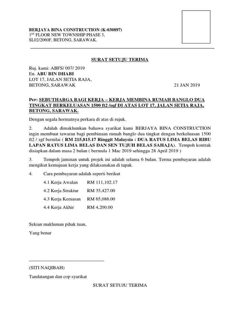 Pdf Surat Setuju Terima Tender Letter Of Acceptance Of Tender Nabilah Aiman Academia Edu