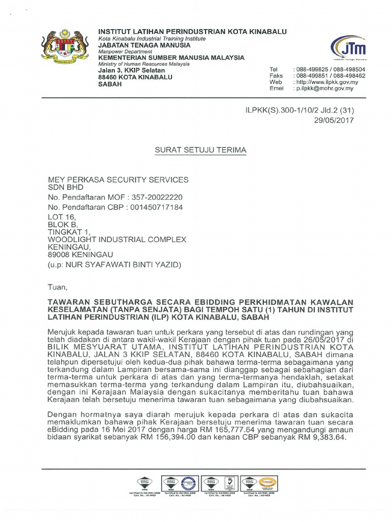 Surat Setuju Terima Sst Sebut Harga Ebidding Perkhidmatan Kawalan Keselamatan Pdf